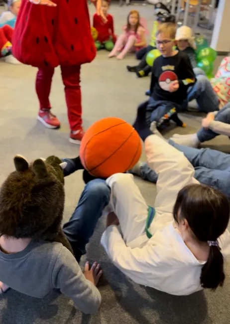 A harmadik feladat egy ügyességi játék volt: a nagy körbe rendeződött gyerekeknek egy óriási labdát kellett kizárólag lábbal továbbadniuk egymásnak. Aki hibázott, kiesett, és azonnal a finomságokkal teli asztalhoz vonulhatott uzsonnázni. Ahogy egyre többen estek ki, a rágcsálás hangja betöltötte a termet, miközben a kör egyre szűkült. A játék végén már csak két