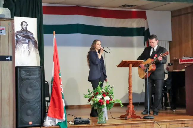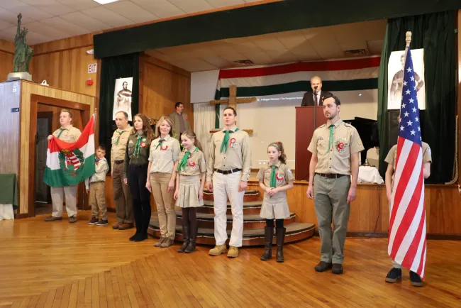 Nagyon színvonalas és megható műsor várta a vendégeket. A 3. sz. Beodray Ferenc cserkészcsapat az esemény fontosságához méltóan nyitotta meg a megemlékezést, énekes bevonulással, zászlószertartással. Miután tisztelegve elénekeltük a Magyar Himnuszt, Tóbiás Attila lelkipásztor nyitóimája következett. Mikolai Éva elhozta hozzánk a miniszterelnöki üzenetet, majd Deer Zsuzsanna készült ünnepi beszéddel a szabadságharc korszakáról. Meghallgattuk a Nemzeti Dalt Sinkovits Imre előadásában, majd Oláh Ibolya Magyarország c. számát énekeltem Tóbiás Attila gitárkíséretével. Ezután következett Prof. Cristopher Ball beszéde, melyet Imre Szófia fuvolajátéka követett. Krasznai Tünde Ilona zongoraművésznő előadása után Fehér Irén szavalta Petőfi Sándor, Magyar vagyok c. versét, majd ismét egy magyar dal következett – Kormorán: Isten ujja megérintett. Nagyon nagy megtiszteltetés volt számomra, hogy elénekelhettem a szívemhez közelálló dalt egy ilyen eseményen. A Szózatot ismét Sinkovits Imre előadásában hallgattuk, majd elénekeltük az amerikai himnuszt, a megemlékezést pedig Király Tibor lelkipásztor áldása zárta. A wallingfordi családias hangulat most is végig velünk volt és az ünnepség végeztével is még sokáig maradtunk beszélgetni és természetesen elfogyasztani a sok finomságot, amivel a szervezetek készültek.