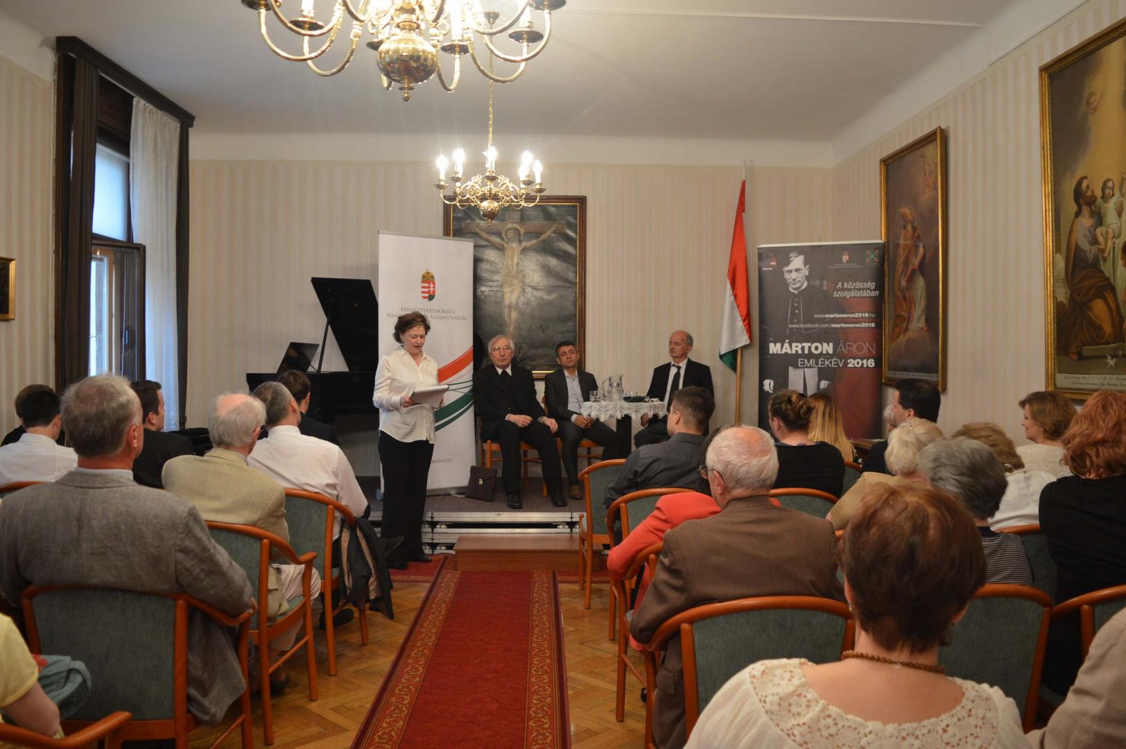 A szentmisét követően a Pázmáneum dísztermében a bécsi Márton Áron Emléknapok rendezvénysorozat harmadik programjaként emlékülés vette kezdetét, amelyet Hegyes Ádám és Dányi Árpád zongoraművészek négykezes játéka nyitott meg. Johannes Brahms Német Requiem című zeneművének második, Mert minden test olyan, mint a fű című tétele illő nyitánya volt az estnek, amelyen a nagyszámú emlékező és ünneplő közösséget Potápi Árpád János nemzetpolitikáért felelős államtitkár köszöntötte.
