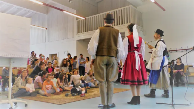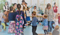 Bolhapiac, kirakodóvásár és sütemények, valamint kézműves programok várták az érdeklődőket. Szorgos kezek készítették a szőlőfürtöket, könyvjelzőket, s színezték az őszi kifestőket. Kereplők kelepeltek, csergett a karikás ostor, s megkezdődött az előadás. Kicsiny kompániámmal, Zombori Anikóval és Kiss Balázzsal, tamburámat pengetve, tánclépésben, énekszóval vonultunk a terembe, hogy előadjuk Benedek Elek „Krisztus urunk muzsikája” című meséjét. A teremben pengett a citera tanítványom Vörösné Fail Bernadett keze alatt, s brummogott a nagybőgő Győre Gábor vonójától. Miután bemutattuk az általunk körözött szőlőpusztító madarat, a seregélyt, tanultunk egy dalt, s a közönségből választott szereplőkkel eljátszottuk történetünket mindenki nagy derültségére. Végül a seregélyekkel táncoltunk egyet tekerőmuzsikámra, hogy jobban essen a must.