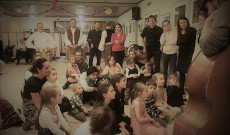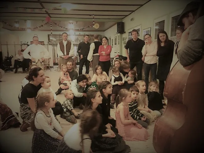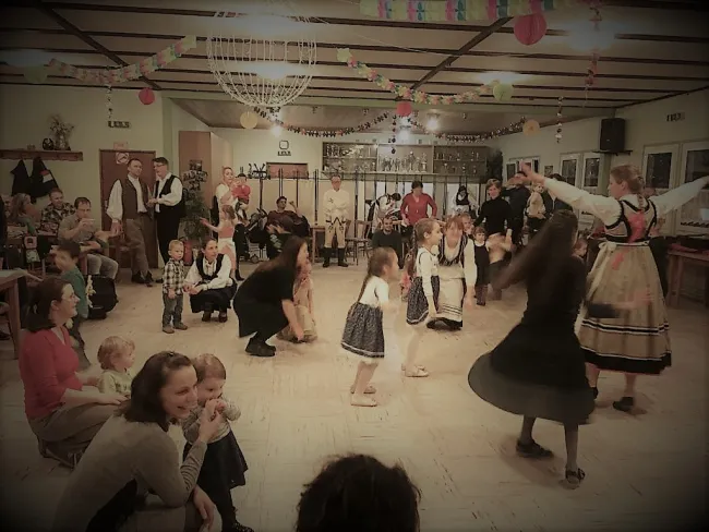 Eszter még Brazíliában töltötte második ciklusát a Kőrösi Csoma Sándor Programban, mikor engem megkeresett. Így vágtunk bele a szervezésbe a „Tűzvirág” Néptáncegyüttessel és a Nürnbergi Magyar Kultúregyesülettel közösen. A vasárnapi időpont nem volt éppen ideális, de így is szépen megtöltöttük a termet táncolni vágyó gyermekekkel, felnőttekkel. A gyermektáncházban én a kézműveskedést vállaltam magamra, s sorra készültek a különféle csörgők, rece-ficék… Míg megérkezett a zenekar, Eszter hegedűje szolgáltatta a muzsikát. A táncokat, népi játékokat Körtvélyesi Anna és Szórádi Viktor néptáncpedagógusok tanították, s nem voltunk híján a tréfás jeleneteknek sem, a gyermekek nagy örömére. Miután sikeresen összeadtuk a büdös lábú ökörcsordában nevelkedett Pistát és a hosszú hajú, rövid eszű, tyúkólban nevelkedett Iluskát, egy nagyot táncoltunk. Pihenésként kis táncosainknak a zenekar bemutatta vonós hangszereit. Öröm volt látni a gyermekek arcán a rácsodálkozást arra a „csodára”, ahogy megszólalt a hegedű, a brácsa és a nagybőgő. Később a zenekar is szusszant egyet, s én elővettem a tekerőm, melynek kurbliját lelkesen tekerték a gyermekek, kedvenc dalaikat énekelve. Majd Viktor kecskedudája is megszólalt, s egy jót muzsikáltunk mindnyájunk örömére.