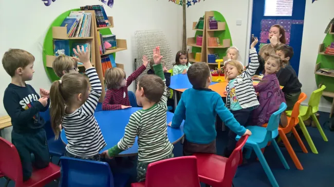A különböző fejlesztő foglalkozásokon szerzett ismeretek, dalok, vidámság mellett az órák utáni levezetésként kinti foci és játék várta a gyerekeket. Mindeközben a benti termek egyikében a motorikus képességeket vették igénybe a segítők.