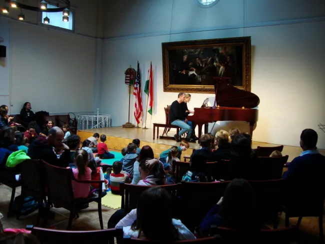 A tanítási nap lezárásaként izgatottan gyűltünk össze a hirtelen koncertteremmé berendezett helyiségben. A legkisebbek a színpad előtti szőnyegen, a nagyobbak a széksorokban foglalták el a helyüket, és kezdődhetett a közös játék. A művészek a színpadon, begyakorolt, bravúros mozdulatokkal a zongorán játszottak, amíg a hallgatóság a képzeletével. A zeneművek között mindenki elmondhatta, hogy milyen képek elevenedtek meg lelki szemei előtt, amelyet a gyerekek bátran meg is tettek. Egymásra licitálva jelentkeztek, és sorolták a legötletesebb, legváratlanabb állatokat, helyszíneket, természeti jelenségeket, amelyeket hallani véltek a hangjegyek között. Amikor pedig szólt a zene, csendben, odaadással figyeltek, vagy a harmóniával sodródva, ritmusra tapsoltak.