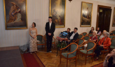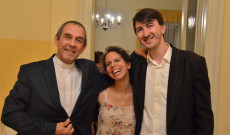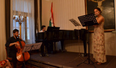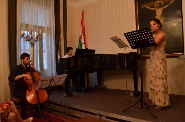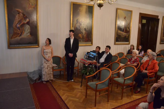 A bemutató közben zenével készültünk a hallgatóság számára: Ripka János és Ablonczy Bertalan kíséretével elhangzott Bach E-moll fuvolaszonátájának 1., 3. és 4. tétele, valamint Gabriel Fauré Álom után című darabja. A jó hangulatú prezentációt Balassi Bálint Áldj meg minket, Úr Isten kezdetű versének eléneklése zárta, amelyet Ripka János kísért csellón, s amellyel szerettünk volna minden jelenlévőt az Úr oltalmába ajánlani bécsi utunk végén. A meglepetések sora azonban nem ért véget, hiszen Pap Péter és felesége csodálatos gyimesi dallamokkal ajándékoztak meg bennünket.