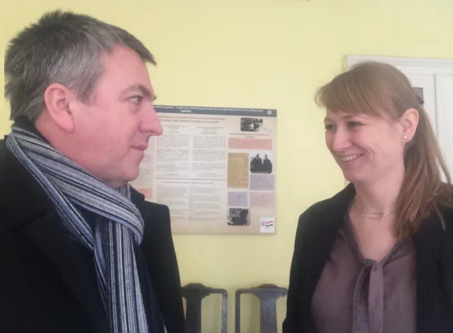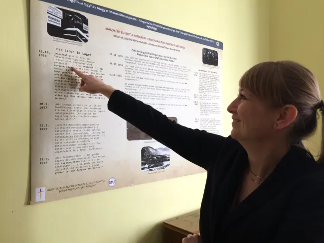 A beszélgetésünket a 60 éves évforduló alkalmából összeállított kiállítás megtekintésével folytattuk. „Az Ausztriai Ágostai Hitvallású Evangélikus Egyház segítségnyújtása menekülteknek 1956/57-ben” elnevezésű tárlat anyagát a gyülekezet levéltárából, valamint Szépfalusi István feljegyzéseiből állította össze a lelkésznő, melyhez adódott még számos dokumentum az Ausztriai Ágostai Hitvallású Evangélikus Egyház püspökségének körleveleiből is. A lelkésznő szakszerű idegenvezetőnek bizonyult, előadásán érezni lehetett, hogy sok munkát fektetett bele.